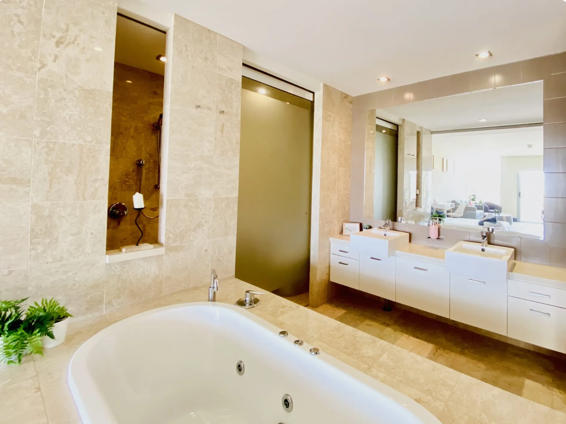 In room spa, double vanity & spacious shower with both standard & overhead rain showerheads
