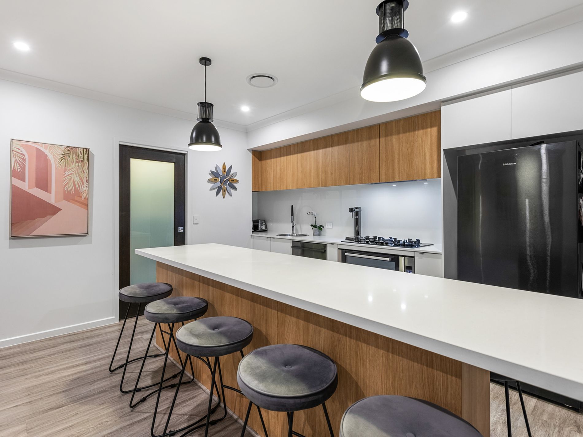 Central kitchen with oversized island bench, flowing to outdoor entertaining by the pool